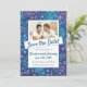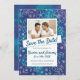 Este anúncio salva-vidas vem completo com uma bela borda de aquarela pintada à mão, em preto e roxo, embelezada com flores brancas desenhadas à mão. Este convite é totalmente personalizável e lhe dá a opção de exibir sua foto favorita como casal. Esta versão contém as palavras "Salvar a data" com as outras informações abaixo. Inclui campos para os nomes, data, local e "convite formal a seguir", que também pode ser substituído por outras informações, incluindo um site de casamento, se houver.