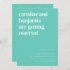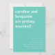 Este convite de casamento impressionante apresenta um grande texto de serifa branco em um fundo de aqua em negrito, criando um estilo de anúncio limpo e confiante. Com um layout minimalista e tom lúdico, é perfeito para casais planejando uma celebração moderna e otimista. Excelente para locais casuais, casamentos de verão ou cerimônias criativas de cidades.