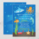 Um adorável convite para chás de fraldas que é o tema de Sob o Mar. O design é fofo e divertido com cores vibrantes como azul, laranja, vermelho e verde. A vida marinha inclui polvo, tubarão, peixe, caranguejo, estrelas e cavalo marinho. Também funciona bem para uma festa de aniversário de criança.