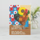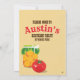 As entradas da feira de campo decoram este convite festivo personalizado. Uma colcha em vermelho e azul, um girassol em um vaso azul, um galo, pêssegos enlatados em um pote coberto por um pano verde amarrado com fio, e um tomate vermelho. No fundo está uma superfície de madeira, e uma parede bronzeada. Perfeito para um país, celeiro ou festa ocidental. Voltar: Adicione seu próprio texto.