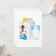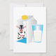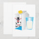 Um copo de leite ao lado de uma caixa de leite com uma imagem de vaca. Este design parece realmente eficaz neste Convites
