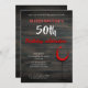 Vidro de Vidro Vermelho Rústico de Madeira 50º Convite de aniversário. 50º convite de aniversário para ele. Convite com uma taça de vinho tinto sobre um fundo de madeira rústica e escura. O texto está em cores brancas e vermelhas e é totalmente personalizável - personalize-o com seu nome, idade, data, local e RSVP.