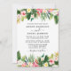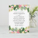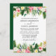O Convite para o Casamento de Calor Tropical de Cor Aquosa Moderna inclui flores de hibisco rosa, flores brancas, flores amarelas, palmeiras e verde botânico. Palm Green Back.