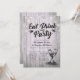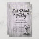 EAT Drink and Party / EAT Beink e Be Casried Celebration Celebration Cards Modelo - Elegante Lettering Script, Vintage Champagne Glass e String Lights on Rustic Wood Background. Um Design Perfeito Para O Seu Grande Dia! Todo Estilo De Texto, Cores, Tamanhos Podem Ser Modificados Para Ajustado Das Suas Necessidades.