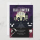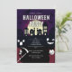 Junte-se a nós por um momento assustador! Este convite de festa de Halloween assustador e divertido é perfeito para estabelecer um humor festivo e assombrado. A design apresenta uma silhueta de uma vila assustadora contra uma lua de cheio gigante, com morcegos voando através do céu noturno roxo. Apanhando jack-o-lanternas, colegas das sombras, enquanto um desenho animado, Grim Reaper, e um pequeno vampiro, aplaudem seus convidados para se juntarem à diversão. Este convite é perfeito para uma festa de fantasia, um monstro, ou qualquer cesta de Halloween com música, dança, comida e bebidas!