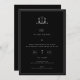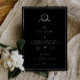 Elegante crista botânica adornada de monograma, A Noite Antes, convite para comemoração de casamento/ensaio. Design de tipografia branca moderna e quic em fundo preto.