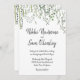 Um elegante convite de casamento tropical pintado por aquarela com um dramático pano de fundo preto de lavagem a aquarela com folhas de palma verdes, pintadas de forma elegante, e sotaque de ouro. Uma caligrafia viva de guião de ouro anuncia seus detalhes de casamento.