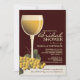 Um wineglass belamente desenhado mão de um vinho branco nestled entre conjuntos dourados gostosos da uva um design perfeito para uma celebração vinho-temático do chá de panela. Quando os amores da noiva wine, se o partido ou o casamento estão em um vinhedo, ou na região vinícola, este design elegante ajustará o palco para seu evento maravilhoso. O vidro de vinho delicada está protegido e guardara um varietal branco bonito enquanto as uvas douradas maduras derramam para fora através de um fundo castanho chocolate profundo, rico. Oferecido aqui no estoque de papel básico, este design igualmente olharia especialmente maravilhoso no linho ou no feltro. Os selos postais de harmonização estão igualmente disponíveis: