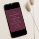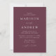 Convite de casamento minimalista e moderno com detalhes de seu casamento em letras brancas com acentos de escrita de caligrafia. O fundo do vinho roxo pode ser alterado para uma cor de sua escolha. Projetado para coordenar com a nossa coleção de casamento do Modern Elegance.