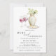 Convites de chá de panela com temas vitivinícolas com uma ilustração aquosa dos vidros de vinho tinto, ao lado de uma placa de cunhas de queijo. Provando cena do vinho com os detalhes do evento abaixo. Cartões casuais com acentos formais de escrita e um verde claro de coordenação no verso.