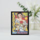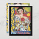 Vintage imagem de uma mulher do Carnaval do Panamá, em 1937, com um vestido de cor brilhante com flores de olhos verdes em seu cabelo e uma multidão de pessoas dançando e celebrando. design azul, amarelo e vermelho de forma divertida.