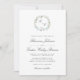 Um convite de casamento elegantemente clássico com uma vintage sente-se apresentando suas iniciais/monograma em um belo anêmono branco de cor aquosa e coroa de folhas/ervas, em um fundo branco. Seus detalhes de casamento estão em cinzas escuras, com seus nomes em fontes de script, e o contrário está em azul claro.