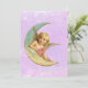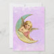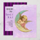 Um convite para uma festa de leitura de tarô. Você pode personalizá-lo para qualquer ocasião que estiver hospedando. Um doce desenho de vintage. Um anjo tranquilo, parecido com uma criança, descansando na curva de uma lua crescente sobre uma moldura em lavanda macia com fundo listrado roxo.