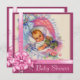 Menina vintage doce e bonito em um rosa e arco adormecido com um convite de chá.