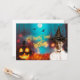 A divertida design de arte alterada apresenta a era vitoriana da mulher negra com chapéu de bruxa alta, mariposa e coroa sobre o passado do Dia das Bruxas surreal, cheia de jack o' lanterna, morcegos e lua de cheio. "É a cobertura de texto neon Witches do Partido". Use de volta para os detalhes da festa do Dia das Bruxas