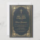 Este convite à comunidade azul, elegante e sagrado, com ar vintage, apropriado para um menino, tem um quadro de ouro vintage com decorações elegantes barrocas de ouro sobre um fundo azul escuro como couro. O nome da criança é escrito em um roteiro caligráfico elegante. Todo texto pode ser personalizado e tem uma cor de ouro semelhante à decoração dourada do quadro. O pano de fundo com suas elegantes decorações de ouro em azul escuro é de uma coleção de cobrir franceses, de Georges Mercier (1885-1939) - Madame de Maupin por Teophile Gautier, volume 1, edição 1911, Paris - agora no dominio público, da Biblioteca Pública de Nova York