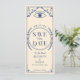Ponha o tom para uma celebração mística. Este casamento inspirado no tarô salve a data com um círculo celeste rodeado por nuvens, luas e sóis, com um olhar radiante no topo. Projetado em azul e creme para uma vibração mágica e inesquecível!