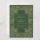 Este elegante convite para o casamento apresenta uma imagem de ouro vintage em ornamentado num fundo verde angustiado, imitando um cobrir antigo de livro. Personalize o texto dourado com seus nomes e detalhes de casamento. O design de quadro é repetido na parte traseira da placa.