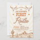 Vintage Brown Orange 1rua Rodeo Birthday Invitation Boys primeiro convite de aniversário rodeio com dois esmaltes, texto ao estilo corda e oeste e uma imagem do deserto ocidental em um plano de sol.