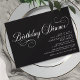 Convites de janto de aniversário formais com a menção "Janto de aniversário" em um roteiro de caligrafia estilo vintage. Os detalhes do evento estão no canto inferior direito. Texto branco sobre um fundo preto contrastante.