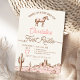 Vintage Pink Brown Horse First Rodeo primeiro aniversario Convite para o primeiro aniversário de rodeio de uma menina doce, apresentando um pequeno cavalo, paisagem do deserto ocidental e texto no estilo de corda. A parte de trás deste primeiro convite de aniversário rodeio apresenta um padrão de sapato de cavalo.