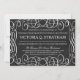 Vintage chalkboard temed bat mitzvah convida são na moda e românticos. Eles apresentam uma tipografia moderna e um ornamentado florescente sobre um fundo de quadro negro em um esquema de cores preto e branco.