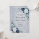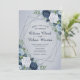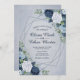 Um convite elegante com os detalhes do seu casamento dentro uma forma geométrica moderna, acentuada com lindas flores em tons de marinho azul, branco e rico sobre um fundo azul macio e empoeirado. Você pode adicionar sua própria mensagem especial indo para o menu personalizar. Este convite é parte de uma bela suíte de casamento que pode ser totalmente personalizada.