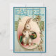 Convide seus amigos e familiares para uma caçada de ovos na Páscoa e brunch com um convite que inclui a reprodução de uma ilustração de Páscoa antiga com um desenho antigo de um coelho segurando uma cesta de vegetais numa mão e um guarda-chuva na outra. O coelho da Páscoa está rodeado por uma forma de ovo cor-de-rosa com flores brancas que se sobrepõem à sua borda. O fundo é constituído por lascas de madeira azul-esverdeadas, pálidas, com a palavra "Páscoa" impressa no topo. A imagem pintada tem uma fina borda branca cercada por uma borda azul mais larga como se tivesse um fosso. Personalize os detalhes do evento na parte traseira da placa na barra lateral. Para ver a Ilustração do Coelho da Páscoa da Vintage em outros itens, clique no link "Artes da Floresta" abaixo.