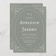 This elegant wedding invitation pairs a beautiful vintage typeface with sans serif font. The white text is framed by a thin oval surrounded by delicate botanical vine motifs in the corners, on a sage green background. The frame is repeated on the reverse, enclosing a pair of monogram initials.