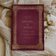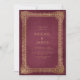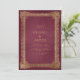 Este elegante convite de casamento apresenta uma imagem de ouro vintage em um fundo vermelho angustiado na imitação de um antigo cobrir de livro. Personalize o texto dourado com seus nomes e detalhes de casamento. O design de quadro é repetido na parte traseira da placa.
