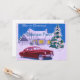 Uma foto retrô de uma casa com um carro vermelho na frente. Há uma árvore de Natal que está toda aparada. Parece o lugar perfeito para uma boa festa de Natal. Está em dominio público.