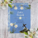 Páscoa religiosa cristã elegante Brunch convida design perfeito para igrejas cristãs e comunidades com lírios brancos Páscoas antigos e nossa antiga e robusta ilustração em fundo azul. Este design floral cristão de Designs Holiday Hearts (direitos reservados) está pronto para você personalizar com os detalhes da sua celebração. Nas costas há um padrão de renda vintage sobre um fundo azul.