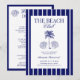 A modern yet retro-inspired beach birthday weekend invitation featuring navy blue and white stripes for a crisp, nautical feel. The main heading reads “The Beach Club” in a striking blend of modern sans-serif and vintage script typography, balancing minimalist clarity with classic elegance. At the center, a hand-drawn palm tree illustration anchors the design, flanked by two clam sea shells on each side—adding a touch of old money coastal charm and luxury seaside vibes. The layout includes a weekend itinerary section, carefully styled to feel both sophisticated and playful, making it easy for guests to follow along. The overall aesthetic blends classic luxury with minimalist design, evoking a timeless yet fresh look that feels perfect for a chic beach celebration.