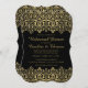 "Convite de festas de Janto Elegante de Lace de Ouro Vintage." Um design elegante, clássico e eterno com rendas metálicas douradas olha borda sobre fundo preto para o tema do seu janto de ensaio. Arte projetada graficamente pela artista e designer internacionalmente licenciada, Audrey Jeanne Roberts, copyright.