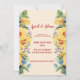 Um primavera de colheita ou convite floral de verão com flores amarelas, azuis e rosa.