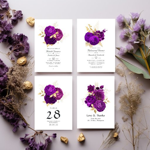 Vintage roxo e convite floral de ouro personalizável para suas especificidades de evento. Ideal para qualquer tema ou casamento de jardim.
