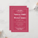 Apresentando um convite de casamento elegante, inspirado na vintage, em rosa viva magenta, com elementos retrorados e uma borda decorativa que belamente enquadra seu texto. O verso é solidamente enfeitado numa tom cativante de viva magenta.