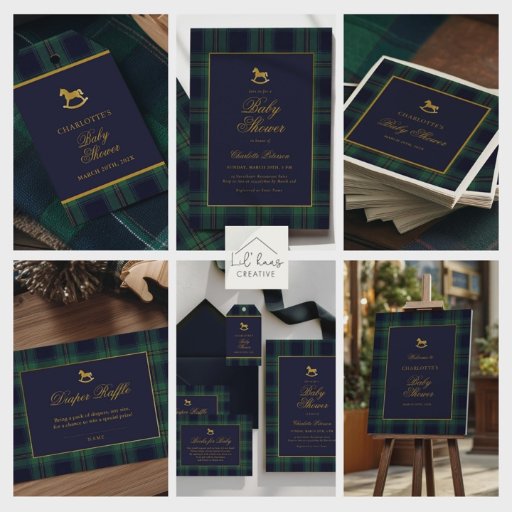 Celebrate your little one with this beautifully designed classic baby shower invitation featuring a rich plaid border and a charming rocking horse illustration. With its elegant typography and traditional style, this invitation is perfect for a refined, cozy, and timeless baby shower theme.