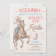 Vintage Pink Any Age Cowgirl Rodeo Birthday Convite ao estilo Poster do primeiro convite ao aniversário rodeio com uma vaqueira e cavalo, texto estilo corda e bota de vaquinha. Este convite para o aniversário é ideal para alguém que procura um convite para o estilo vintage e pode ser usado para qualquer idade.