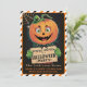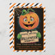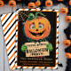 Entra num mundo nostálgico de emoções e arrepios com este venenoso convite da festa de Halloween, projetado para transportar os seus convidados para uma celebração retrógrada da assustação. Este convite impressionante é enquadrado com uma borda riscada em laranja, preto e branco, que chama a atenção, evocando o espírito lúdico e sombrio do Dia das Bruxas do médio século. No coração da design, está um Homem Pumpkin, seu sorriso malicioso e assustador convidando todos que ousam se juntar às festividades. Ele segura um cartaz que diz "Você é Convidado para uma Festa de Halloween", deixando muito espaço abaixo para você preencher todos os detalhes essenciais do evento. Sacudir a placa para encontrar o mesmo encantador padrão diagonal de faixa, garantindo um toque coeso e festivo. Ponha o tom para uma noite de diversão vintage de Halloween que certamente será lembrada!