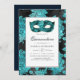 Convite de Quinceanera com uma joia de aquamarina iridescente e turquesa lançada sobre uma máscara de mascarada com um fundo de damasco espumante.