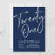 Celebre seu dia especial com este simples convite de festas na moda. Este design apresenta um script "21" de pincel prateado chic com um layout limpo em um fundo azul marinho. Você pode personalizar o texto e a cor do plano de fundo. Mais designs disponíveis no meu compro BaraBomDesign.