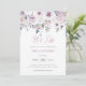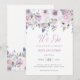 Esses belos convites para casamento florais apresentam uma blush de aquarela, roxo macio e flores brancas com muitas folhas botânicas e elegante caligrafia roxa.
