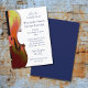 Convite para recital de música violina, com uma imagem de violino em fundo branco. Com a inscrição azul, você pode personalizar com seu próprio texto. O verso tem uma cor azul correspondente para complementar o design na frente. Perfeito para anunciar seu desempenho especial.