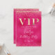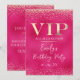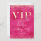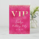 Este convite de festa de passagem de acesso total VIP glamoroso apresenta um design sofisticado em um fundo de estilo texturizado rosa quente. O título VIP é impresso em uma fonte de estilo de folha de ouro, seguido pelo título do evento. Uma faixa de diamantes de brilho dourado acentua as porções superior e inferior. O local e a hora da festa ou evento estão impressos no verso. É perfeito para uma festa de aniversário, sweet 16, chá de noiva ou outra celebração elegante.