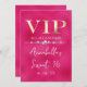 Este convite de festa personalizado apresenta um design VIP glamouroso em um fundo cor-de-rosa quente. O título VIP é impresso em uma fonte estilo folha de ouro, seguido pelo título do evento. Uma faixa de diamantes separa o texto. O local e a hora da festa ou evento são impressos no verso. É perfeito para uma festa de aniversário, festa de 16 anos, chá de noiva ou outra celebração elegante.