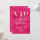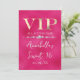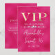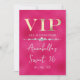 Este convite de festa personalizado apresenta um design VIP glamouroso em um fundo rosa vibrante. O título VIP é impresso em uma fonte estilo folha de ouro, seguido pelo título do evento. Uma faixa de diamantes separa o texto. O local e a hora da festa ou evento são impressos no verso. É perfeito para uma festa de aniversário, festa de 16 anos, chá de noiva ou outra celebração elegante.