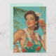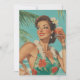 Uma mulher glamourosa com um vestido floral e o lei havaiano desfruta de um cocktail debaixo de palmeiras, irradiando charme retrô-ilha e felicidade de férias.