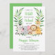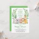 Um convite para chás de fraldas virtuais, brilhante e animado, com um teor de folhas de samambaia tropical com animais de jardim zoológico (leão, elefante, zebra, macaco e girafa) na parte inferior e "Está prestes a ficar selvagem", "Chá de fraldas virtual" e o nome da mãe em um divertido roteiro brilhante de verde limão tropical e cinza suave de tipo manuscrito para a tipografia moderna. Você pode personalizar facilmente os detalhes do chá virtual.