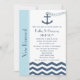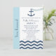 Este convite para renovação de votos divertidos apresenta uma âncora em azul com uma cadeia cardíaca azul mais leve. As palavras "Vow Renewal" aparecem ao longo do lado. Você pode personalizar todos os detalhes de sua renovação de voto neste convite. O melhor de todos os seus detalhes aparece entre a âncora e o mar de chevron abaixo, que está em azul e branco. Direitos autorais